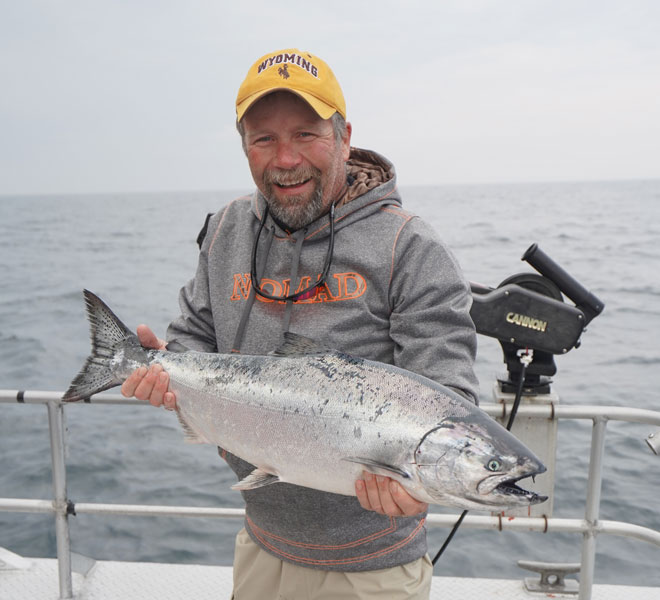 We moved about 14 miles to troll for salmon and lit them up. In about two hours, 18 coho and 7 more kings hit the deck. Using downriggers, Hot Spot 11-inch flashers and Silver Horde Coho Killer spoons, we trolled at 2- to 3 knots at 35- and 45 feet deep in 120 feet of water. In general, the kings were deeper than the coho. The Silver Horde Coho Killer is a great bait to imitate needlefish and the coho we caught were plugged full of them. The spoon is very light, so use a short leader—say about 24 inches—so that the flasher can impart movement to the spoon.