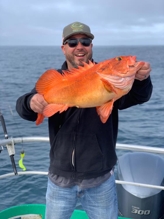 Captain Curtis with a giant Yelloweye Rockfish caught by a client on the Arctic Warrior recently on a day fishing trip.