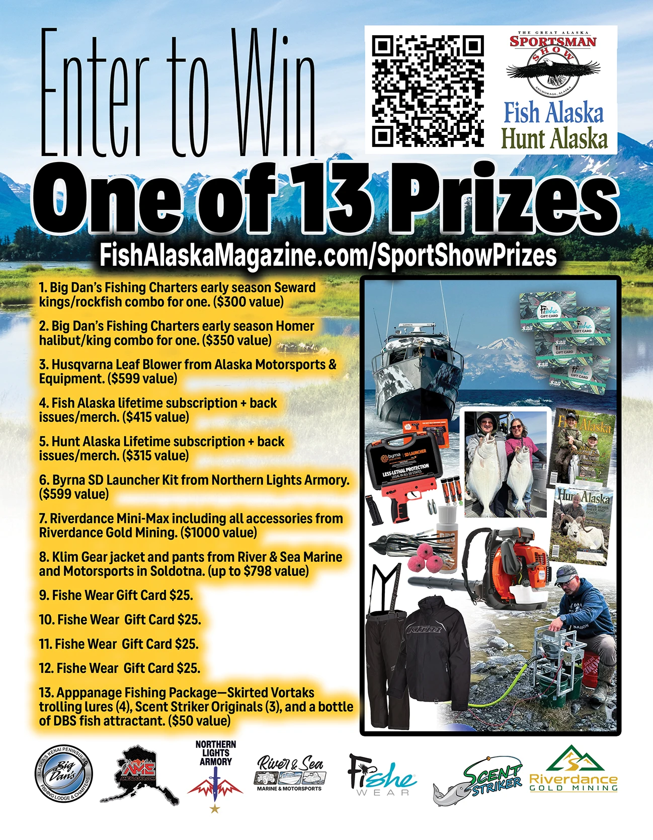 Enter to win one of 13 amazing prizes from our show sponsors. From fishing charters to gear and beyond, we’ve got something for every Alaska outdoor enthusiast.